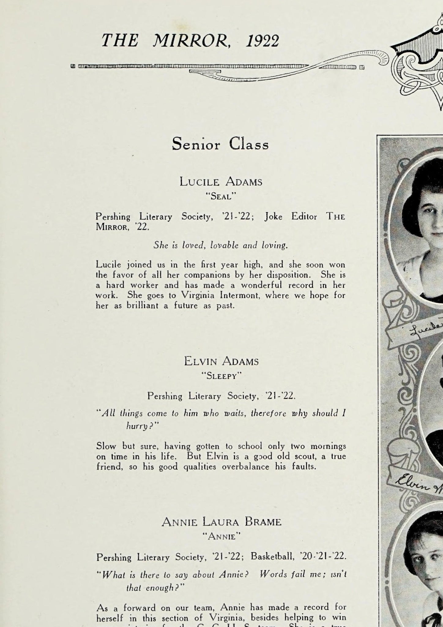 She is enthusiastic and has a bright smile for everyone. Her happiness is almost contagious, and where Abbye is there is plenty of fun. She works and is always ready to answer. Teachers as well as pupils find in her the willing helpfulness on which we all can depend.