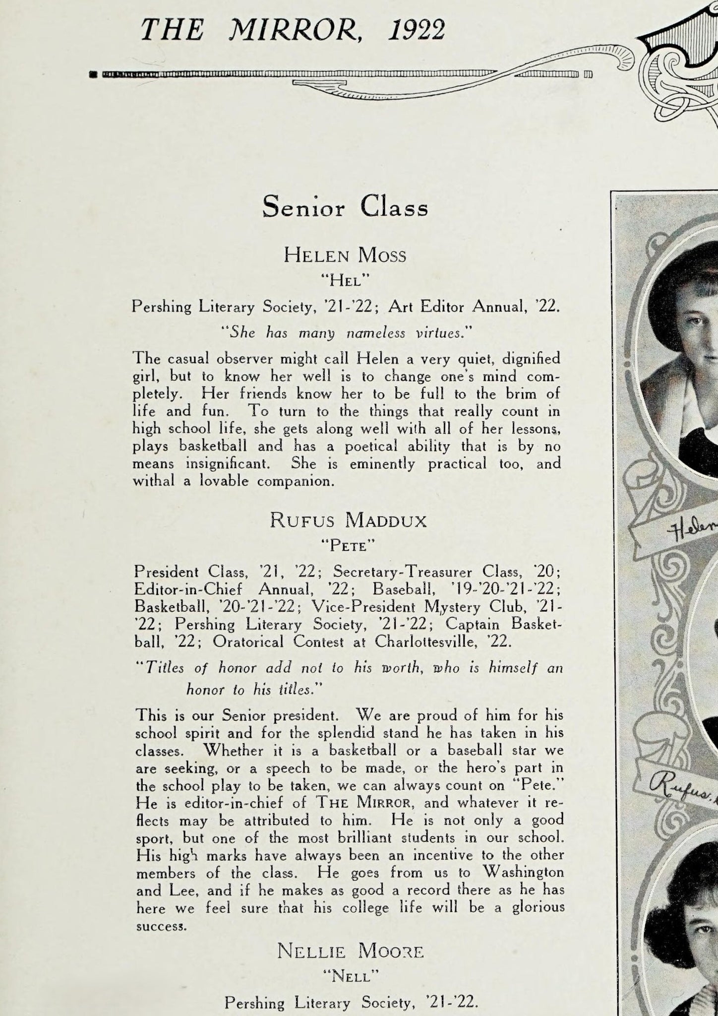 Pershing Literary Society, ’21 ; President Literary Society, ’22; Basketball, ’20-’21-’22; Captain Basketball, ’22; Associate Editor Annual, ’22; Secretary-Treasurer Athletic Association, ’22; Reading Contest at Charlottesville, ’20-’21- ’22.