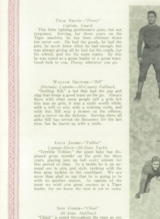 20. Tigers receive first defeat of football season; Tuscaloosa 12: B. H. S. 6. 26. B. H. S. ends football season, Fairfield defeating the crippled tiger team 6 to 0.