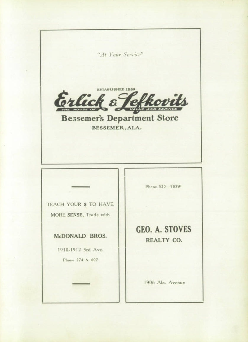 Members of the faculty, you have done for us the greatest service possible in this world, we have never so appreciated as at this hour, A new spirit of mind, a new mode of thought, a new vision of light, these you have given us. and we propose to be worthy of them, we have only to ask vcu. Now as Bessemer High School grows and its field of influence widens, the professionalism of teaching may not divorce the instruction of tile class room from the instruction of daily life. But may the years as they come, make the new High School life, whose precursors we already see. a center at once of intelligence, of illumination and of faith, potent throughout the land.