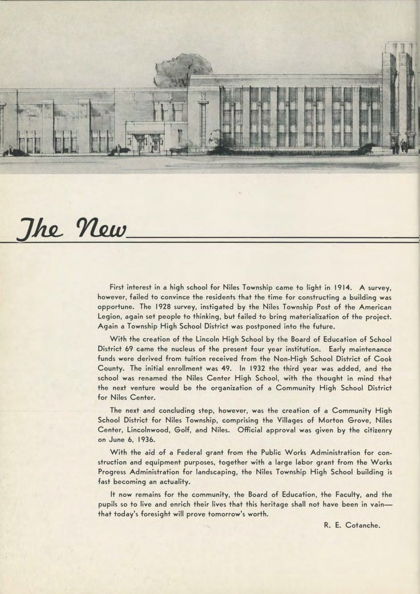 District 69 came the nucleus of the present four year institution. Early maintenance funds were derived from tuition received from the Non-High School District of Cook County. The initial enrollment was 49. In 1932 the third year was added, and the school was renamed the Niles Center High School, with the thought in mind that the next venture would be the organization of a Community High School District for Niles Center.