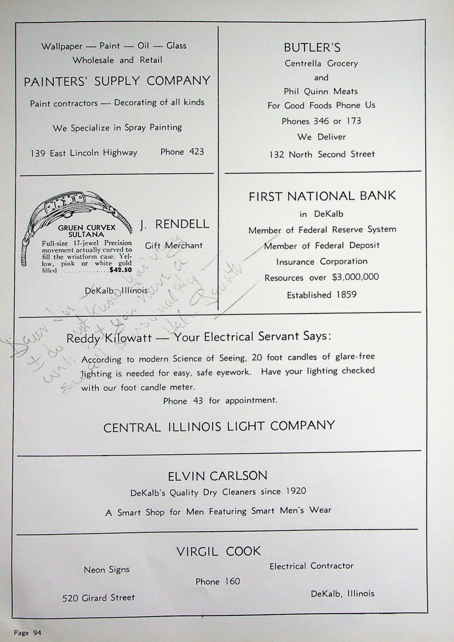 Digital download of 1941 DeKalb Township High School yearbook in DeKalb, IL. This item is a scanned copy of the original yearbook. This yearbook has photos of the school and students. The school yearbook also has information about students and activities at the school. This yearbook contains about 108 scanned pages. The name of the yearbook is the Kalibre 1941. The Township of DeKalb is located in DeKalb County, Illinois. ***DIGITAL DOWNLOAD ONLY (PDF Format File)*** Please review all of the sample pages. Send us a message if you want us to check to see if a name is in the year book. **There is original handwriting int his scanned copy of the book.
