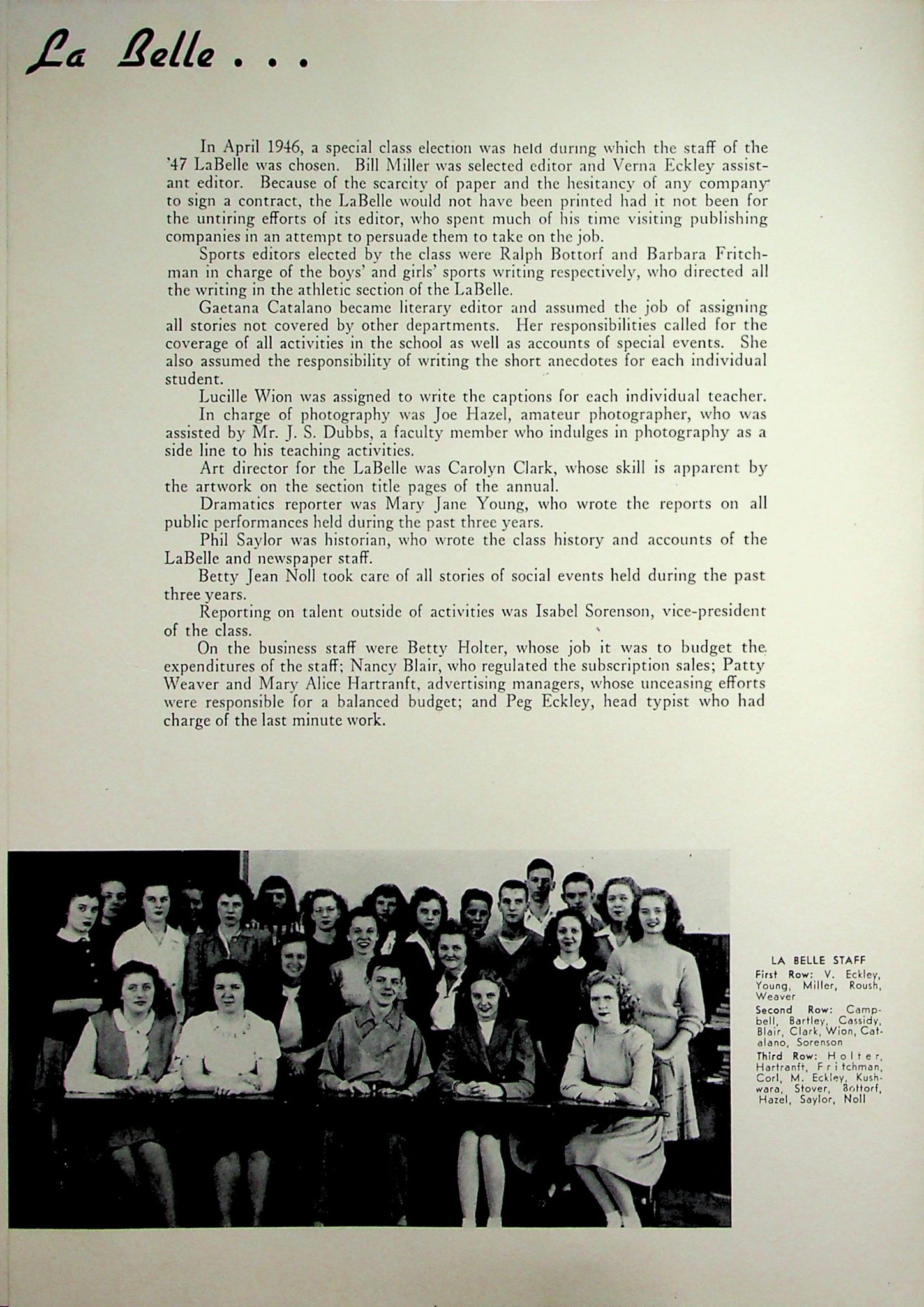 Digital download of 1947 Bellefonte High School yearbook in Bellefonte, PA. This item is a scanned copy of the original yearbook. This yearbook has some photos of the school and students. The yearbook also has information about students and activities at the school. The yearbook has approximately 96 scanned pages. The borough of Bellefonte is located in Centre County, Pennsylvania. The name of the yearbook is The La Belle 1947. ***DIGITAL DOWNLOAD ONLY (PDF Format File)*** Please review all of the sample photos. Send us a message if you want us to check to see if a name is in the book. There is some original handwriting in this scanned copy of the book.