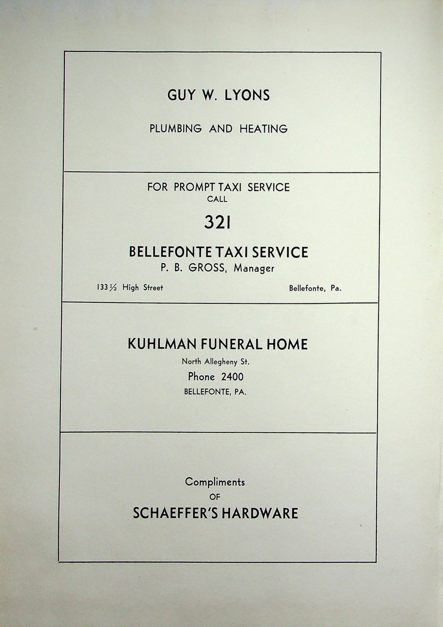 Best Wishes CLASS OF '47 JOSEPH C. HAZEL PLUMBING 8 HEATING Compliments of THE FARMER'S NATIONAL BANK BELLEFONTE, PA. Member Federal Reserve System Member Federal Deposit Ins. Corp.