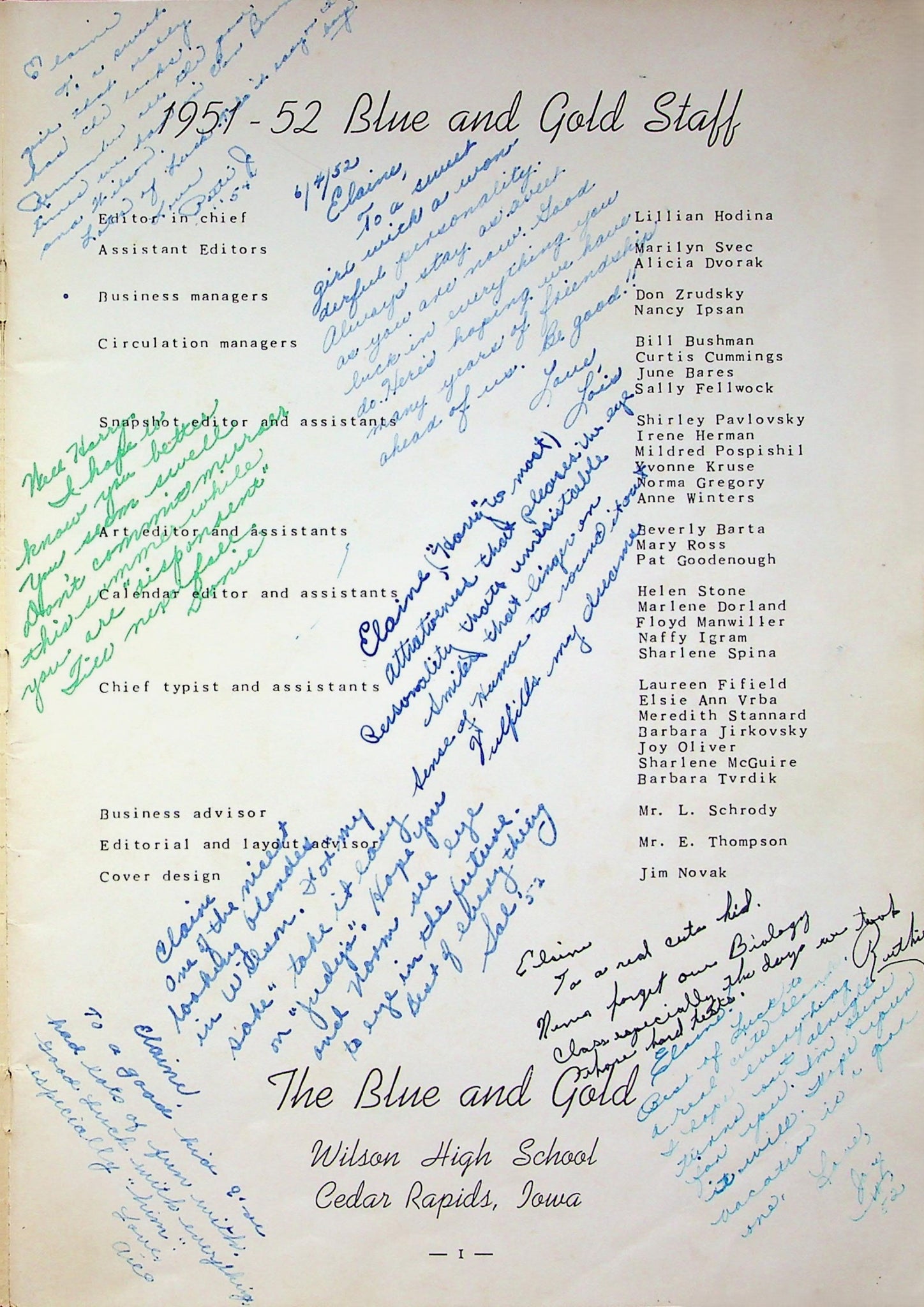 Digital download of 1952 Wilson High School yearbook in Cedar Rapids, IA. This item is a scanned copy of the original yearbook. This yearbook has photos of the school and students The yearbook also has information about students and activities at the school. The yearbook has about 52 scanned pages. The name of the yearbook is The Blue and Gold 1952. The city of Cedar Rapids is located in Linn County, Iowa. ***DIGITAL DOWNLOAD ONLY (PDF Format File)*** Please review all of the sample photos. Send us an email if you want us to check to see if a name is in the year book. **There is original handwriting in this copy of the book.