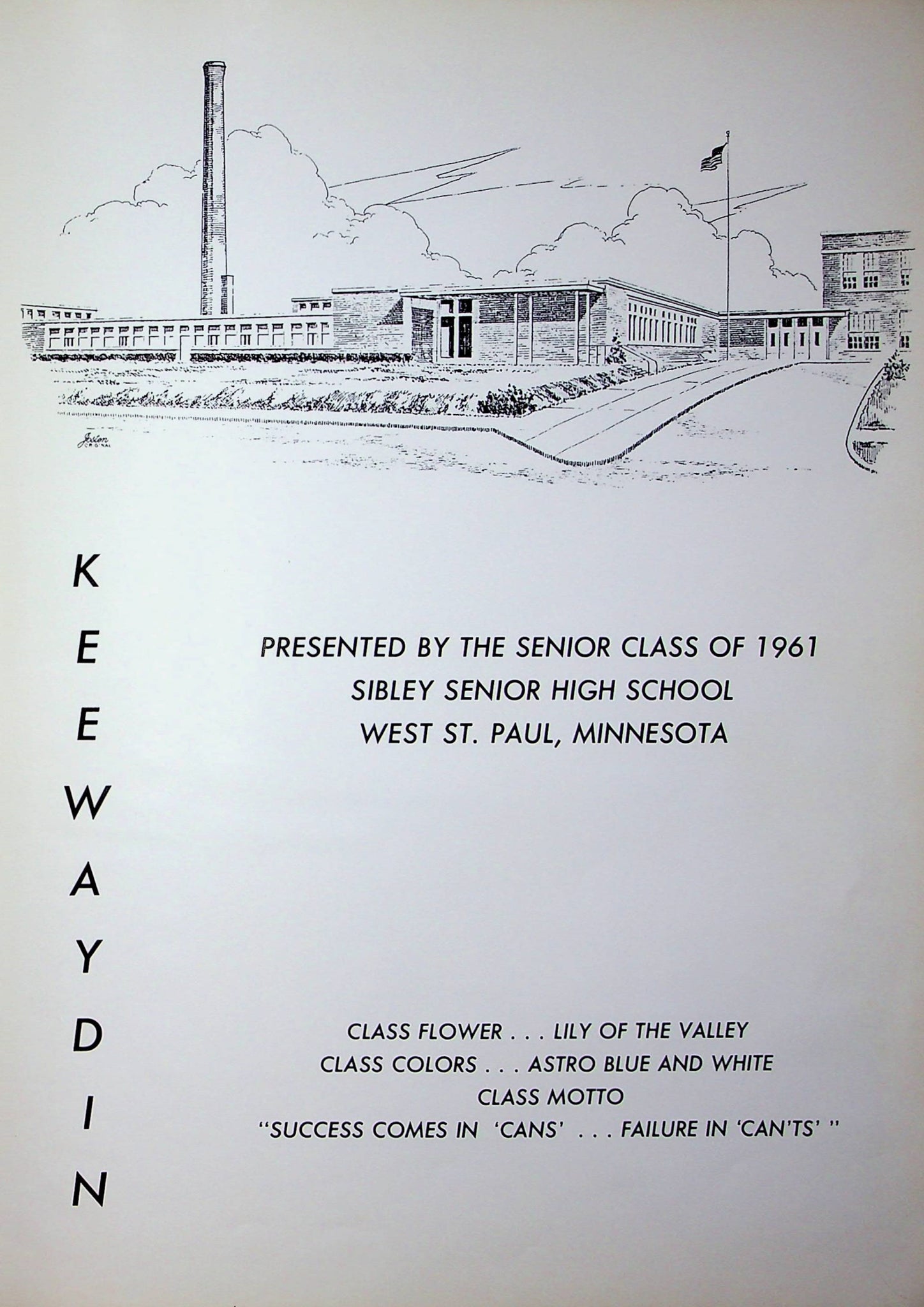 Digital download of 1961 Sibley High School yearbook in W. Saint Paul, MN. This item is a scanned copy of the original yearbook. This yearbook has some photos of the school and students. The yearbook also has information about students and activities at the school. The yearbook has about 168 scanned pages. The name of the yearbook is The Keewaydin 1961. The City of West St. Paul is located in Dakota County, Minnesota. ***DIGITAL DOWNLOAD ONLY (PDF Format File)*** Send us a message if you want us to check to see if a name is in the year book. There is handwriting in the yearbook.